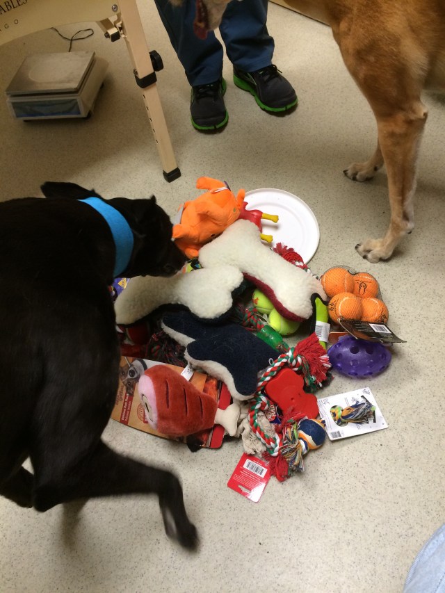 Of course the best part of donating blood, as far as Tiger and Truman are concerned, is when it’s all over, and Jill hauls out the toy box. Each dog gets to pick out one new toy to take home.