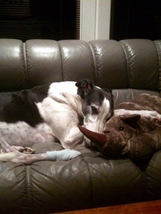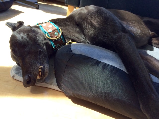 Next morning he woke me up with a sloppy kiss at the usual time. Tiger is a very reliable fur alarm. He played with his toys and danced around while I put the leashes on him and Truman. I was ready to declare the Trazodone experiment a success, until halfway through our walk Tiger yakked up that yellow bile that dogs do sometimes on an empty stomach, or after eating grass. He clearly was still feeling the effects of his altered state. After breakfast, he fell sound asleep. My poor boy was clearly nursing a hangover.