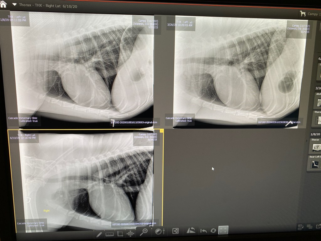 I had our vet take another set of chest X-rays. Unfortunately, they show an ominous spot on his lung that wasn’t there in the last two X-rays taken in January and March. This is really soul-crushing news. Campy had been doing so well up until now.