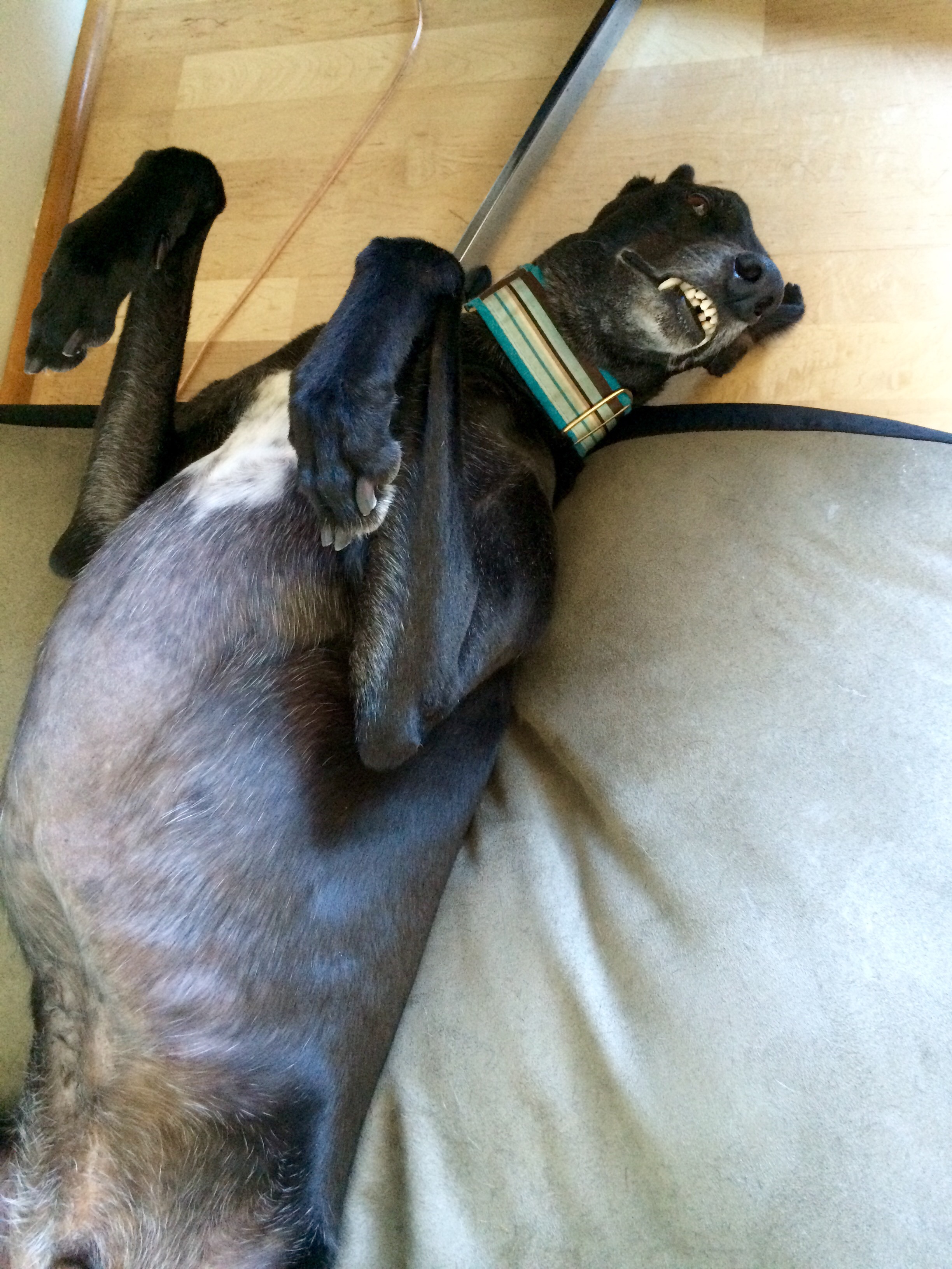 Truman was fresh off the racetrack and had never lived in a home. So much to learn! Stairs, glass doors, playing with toys, these are all foreign concepts to a newly-retired racing greyhound. He spent his first few hours in his new home staring at his reflection in a full-length mirror in our bedroom.