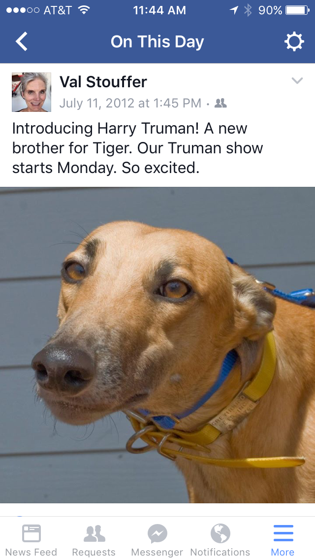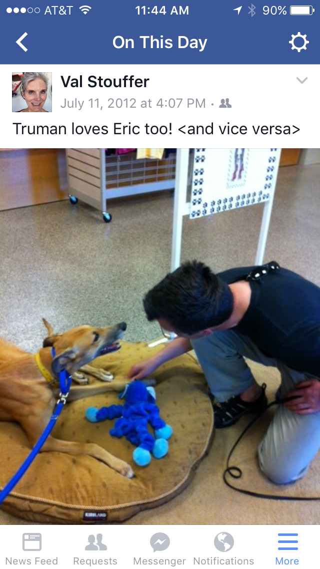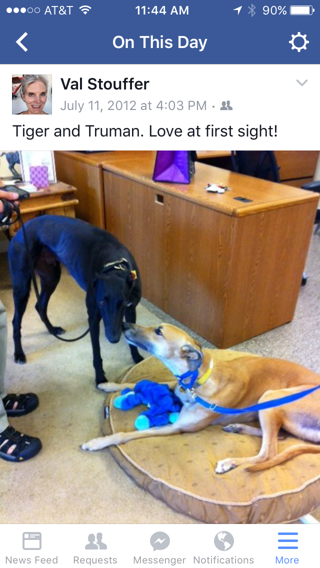 Eric and I were not the only ones devastated by Truman’s death. Tiger became despondent, deeply missing his best friend. Tiger chose Truman to come live with us back in 2012, after meeting several other greyhounds at Greyhound Pets, Inc.